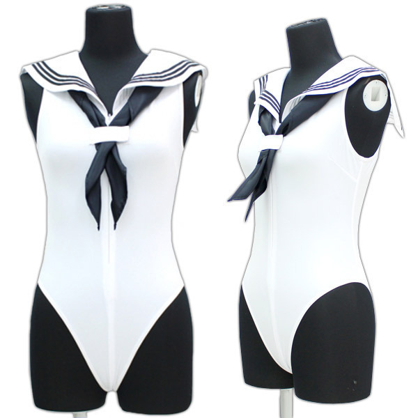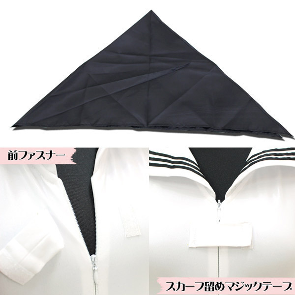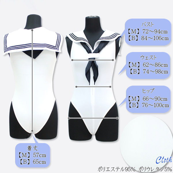 サイズ/仕様:BIGサイズ:B84〜106cm・W74〜98cm・H76〜100cm 着丈65cm セット内容:レオタード(前ファスナー)、スカーフ(マジックテープ) 素材:ポリエステル95%、ポリウレタン5% セーラーノースリーブレオタード 色:白