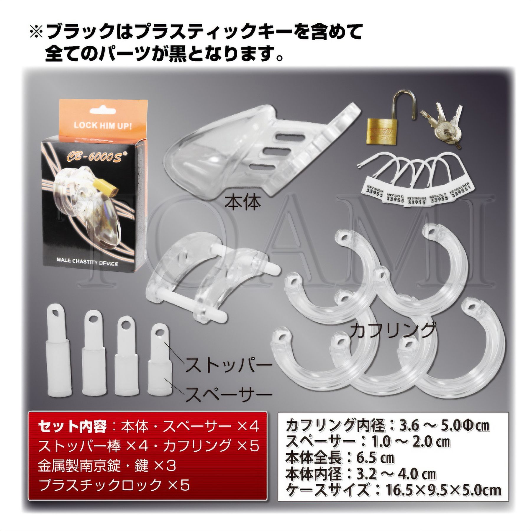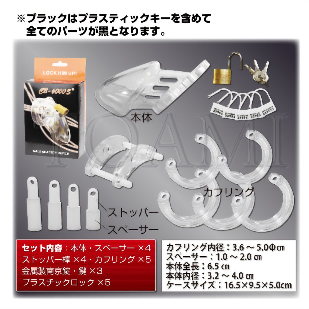 大きさの異なるカフリングとピンが付属していますので、フィット感の調節も可能です!また装着したまま排泄もできるので、装着後に付属の南京錠、またはプラスティックロックで鍵をかければ、日常的に拘束&勃起制限を行えます。