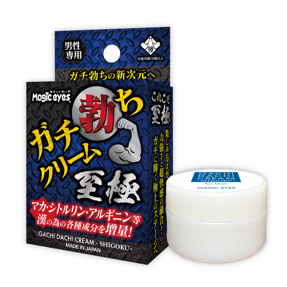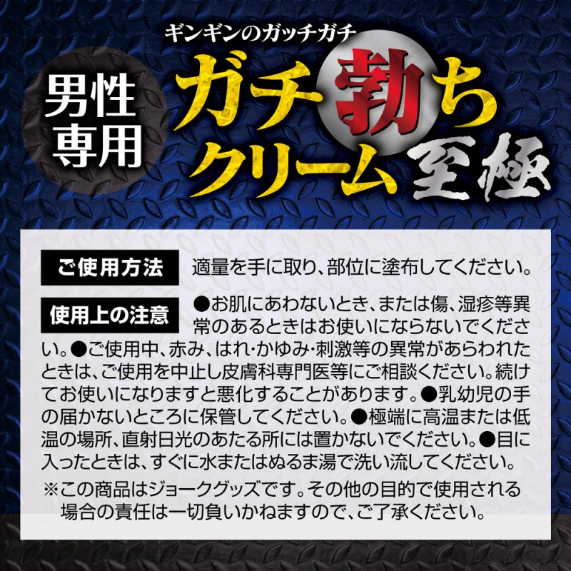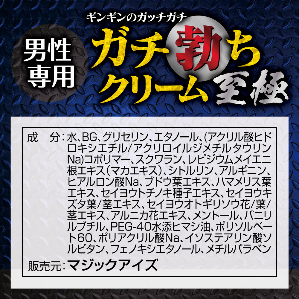 マカ・シトルリン・アルギニンなど漢の為の各種成分を増量しました!さっとひと塗りみなぎる自信、ギンギンのガッチガチ!夜のお供に一人でもパートナーとも楽しみ方はガチ一筋!安心の日本製