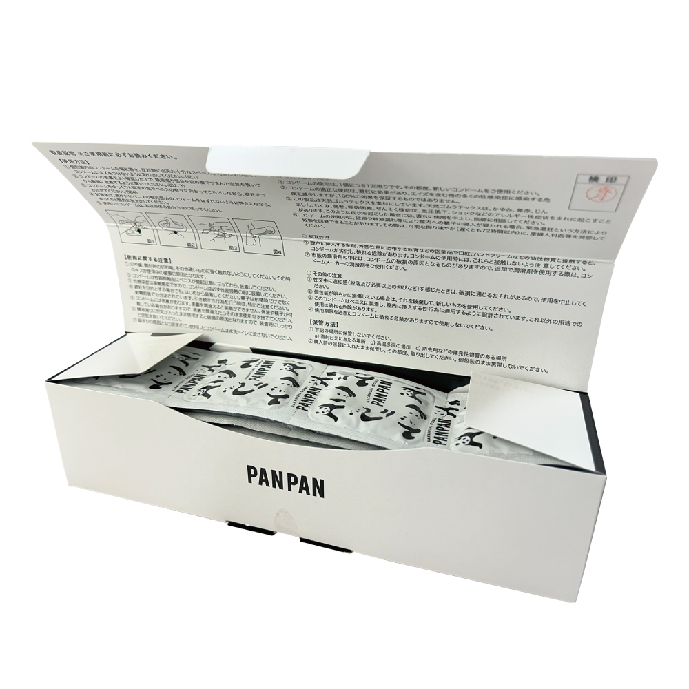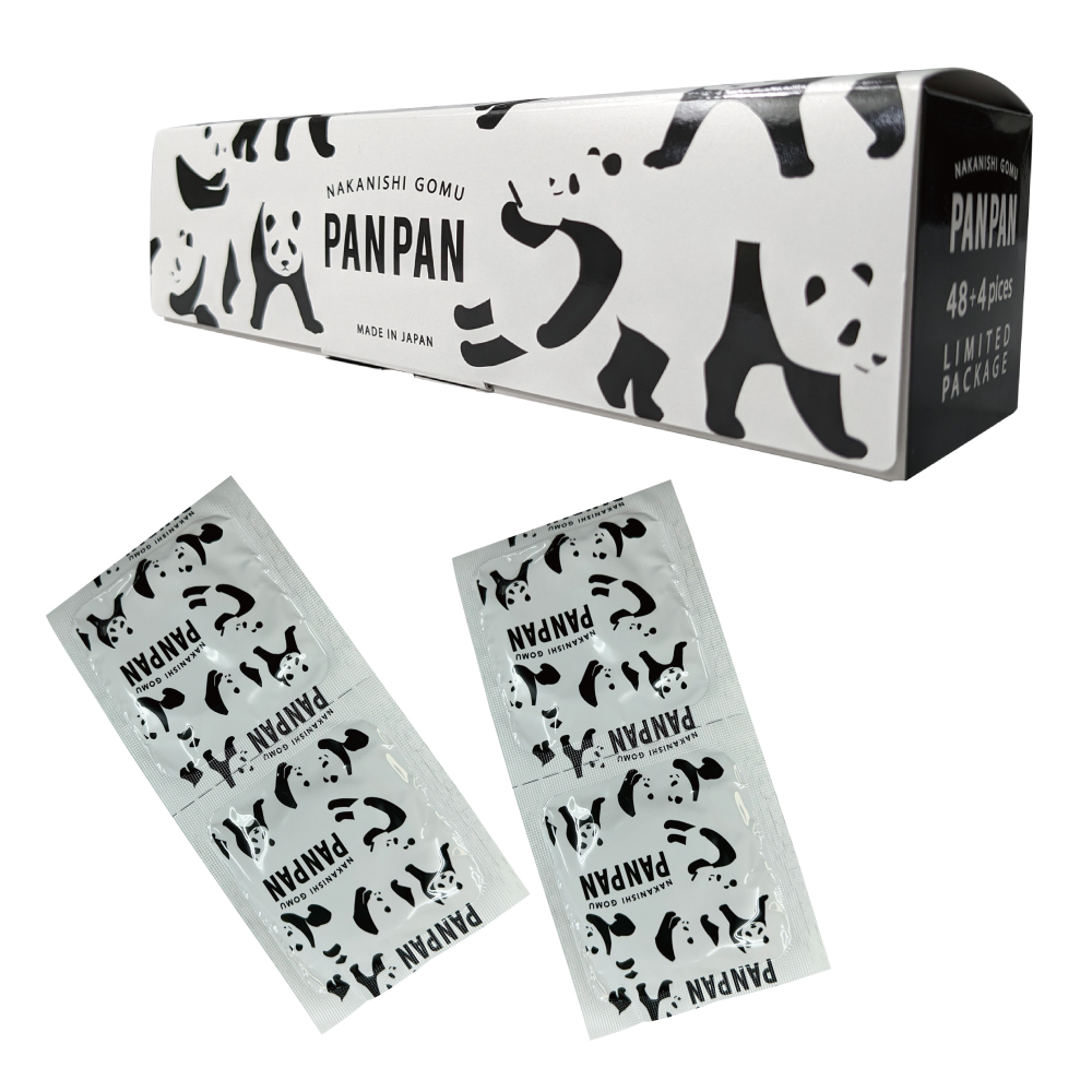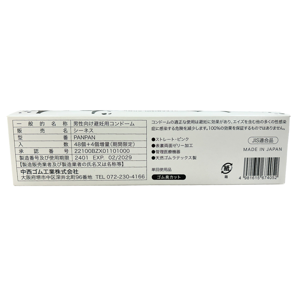 52個入りで、ちょうど良いサイズ感を提供します♪12個入りでは足りないし、144個入りでは多すぎると感じている方にぴったり!この製品は、最薄部0.03㎜の薄型デザインで、快適な使用感を実現しています。胴細形状による脱落・逆流防止機能と、両面ゼリー加工が施されており、安全にご利用いただけます♪見た目は普通の商品パッケージのようで、コンドームとは分かりにくいデザインが特徴!可愛いパンダのイラストがプリントされており、プレゼントやサプライズにも最適です♪製造は、業務用コンドームでNo.1の売り上げを誇る中西ゴム製。安心のJIS適合品で日本製です!