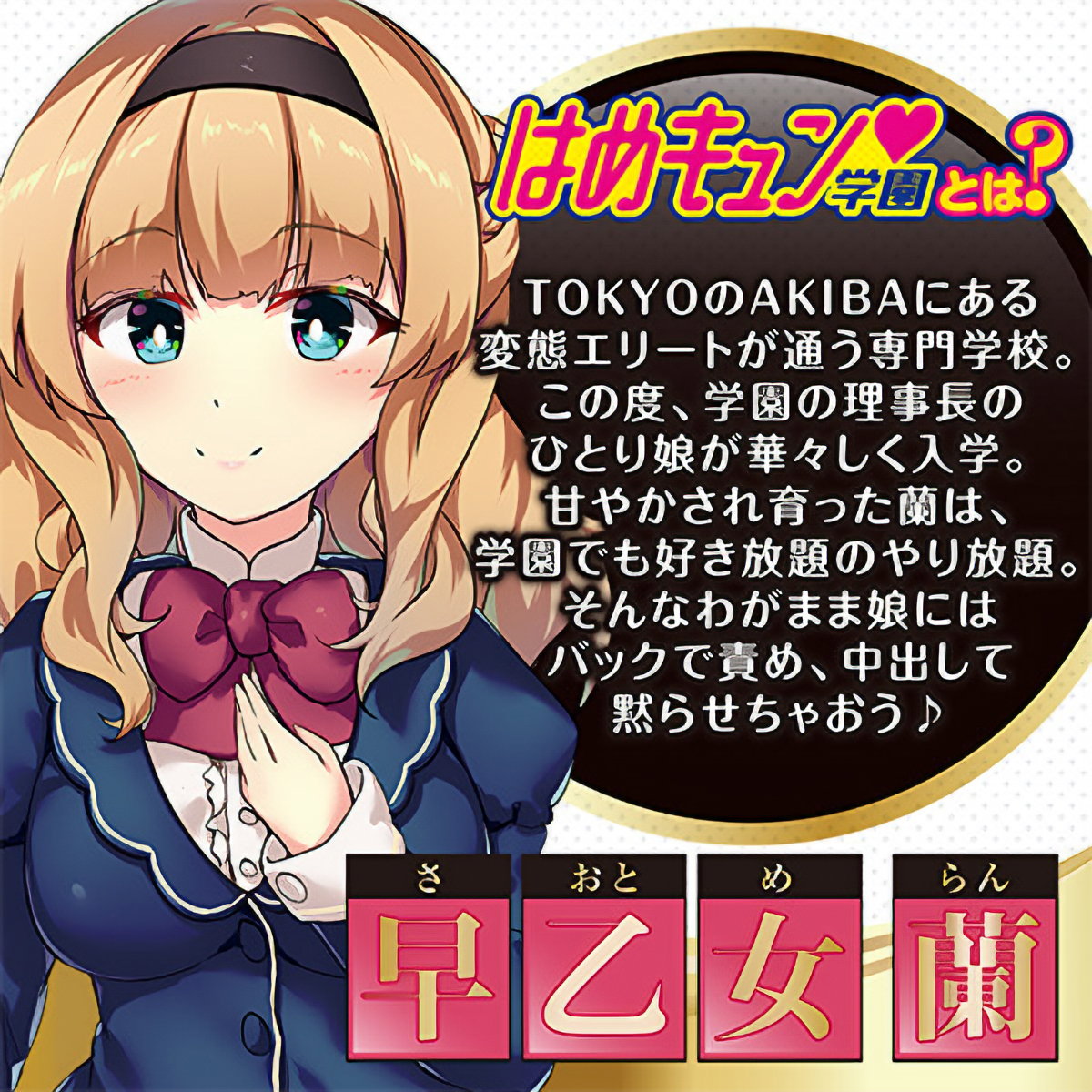 性春日本代表♪アニメ系エアドールシリーズ「はめキュン学園」に、学園理事長のひとり娘『ラン』が華々しく入学!!甘やかされて育った『ラン』は、学園でも好き放題のやり放題。そんなわがまま娘にはバックで責め、中出して黙らせちゃおう♪お好きなコスチュームや下着を付ければ妄想度さらにアップ!!オナホールとローションがセットになっているから、買ったらすぐに使える。発売中のヒマリ・メイ・レイカ・アヤカ・イチカ・ルナを揃えれば、学園ハーレムプレイも♪毎日がちょっぴり刺激的になっちゃうはめキュン学園で、性春をマンキツしよう♪<illustration>wingheart。