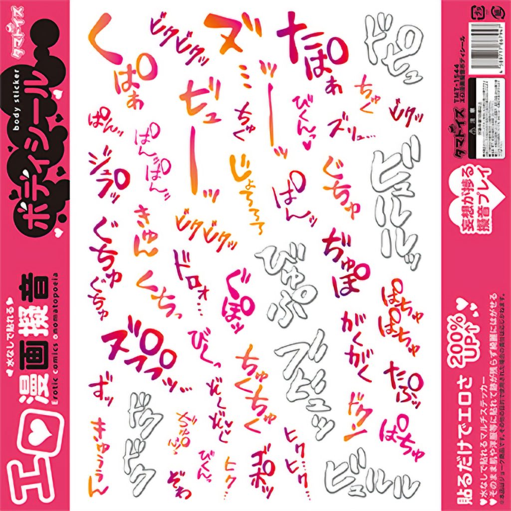 エッチをするときの様々な擬音がエロいフォントで身体に貼れるシールになりました♪「エロ漫画擬音ボディシール」。水なしで貼れるので使いたいときにスグに貼れる!パートナーの身体に卑猥な擬音文字を貼り付けて妄想が捗る擬音プレイに♪跡が残らず簡単に剥がせるのでプレイとシンクロしながら興奮し、プレイの後も処理は簡単。本品はジョーク商品です。その他の目的で使用された場合の責任は応じかねます。●メーカー型番:TMT-1544