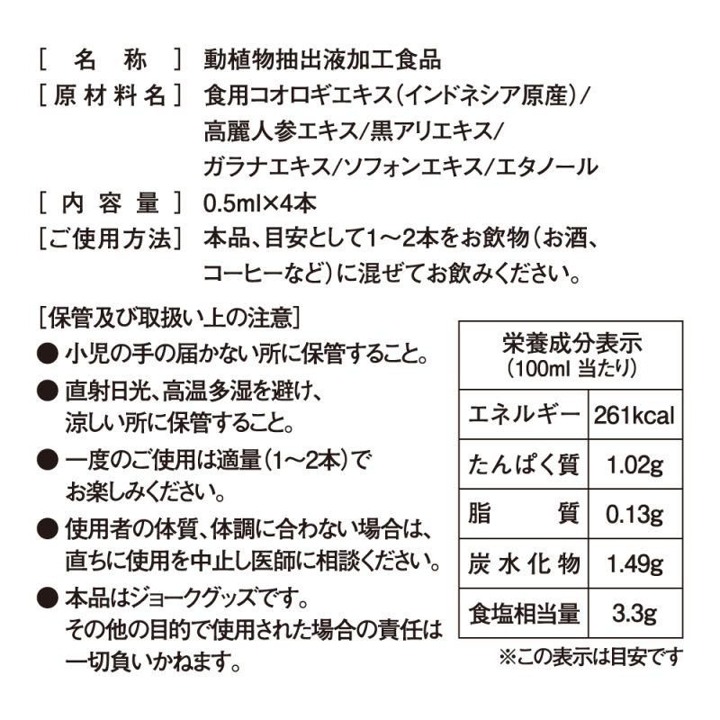 「原材料名」食用コオロギエキス、高麗人参エキス、黒アリエキス、ガラナエキス、ソフォンエキス、エタノール。